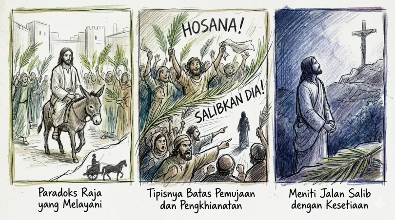 Refleksi: Di mana posisi kita dalam kerumunan itu? Betapa mudahnya kita memuji Tuhan saat hidup terasa diberkati, namun dengan cepat menyalahkan atau meninggalkan-Nya saat doa kita tidak dijawab sesuai keinginan. Minggu Palma mengundang kita untuk memeriksa konsistensi iman kita di tengah arus opini publik.