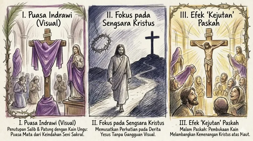 - Fokus pada Sengsara Kristus: Dengan tertutupnya patung-patung orang kudus, perhatian umat tidak terbagi. Gereja ingin kita memusatkan seluruh pikiran hanya pada misteri penderitaan Yesus yang sedang kita renungkan.
