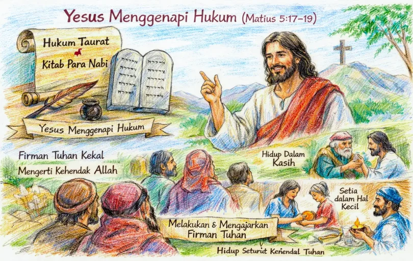 Dalam Injil Matius 5:17–19, Yesus berkata bahwa Ia datang bukan untuk meniadakan hukum Taurat atau kitab para nabi, tetapi untuk menggenapinya. Pernyataan ini sangat penting, karena banyak orang pada waktu itu mengira ajaran Yesus akan menggantikan atau menghapus hukum lama. Namun Yesus justru menegaskan bahwa hukum Allah tetap memiliki nilai yang besar.